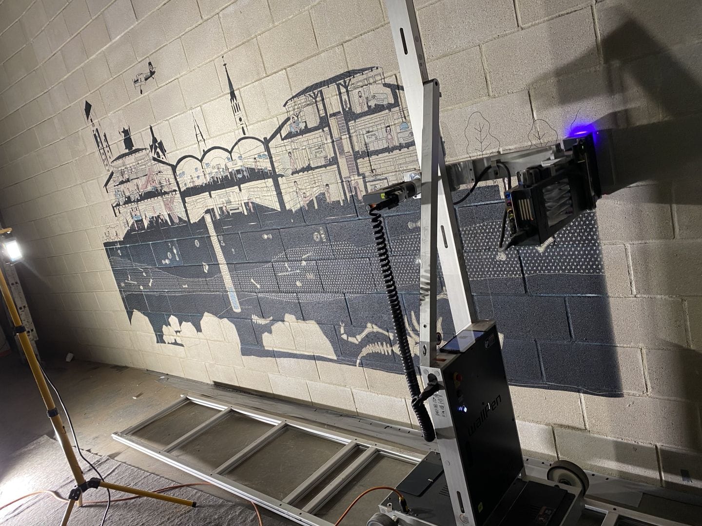 Een wall printer tovert muren razendsnel om tot indrukwekkende creaties, gewoon met één druk op de knop